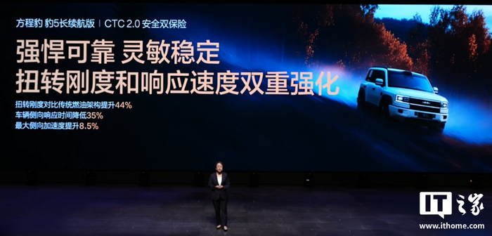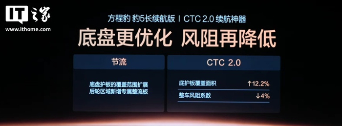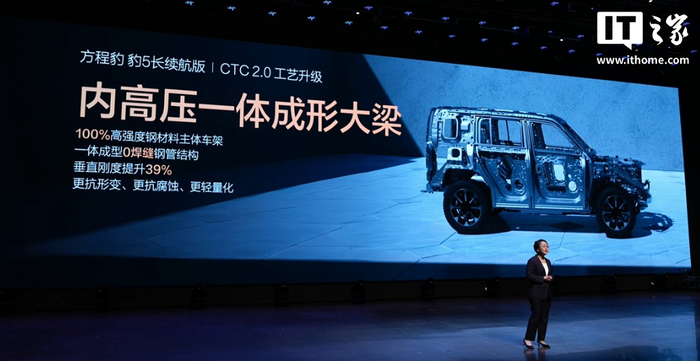 豹 5 长续航版迎来 CTC 电池底盘一体化技术的 2.0 版本重大升级,配有 47.8kWh 电池,CLTC 纯电续航可达 210km(长续航模式,原版为 125km),综合续航可达 1310km。