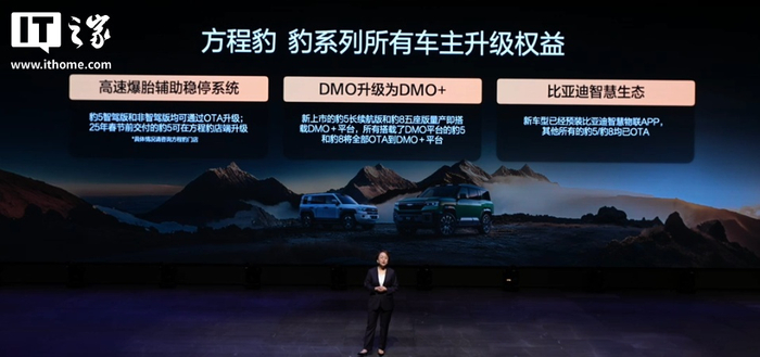 方程豹豹 5 长续航版、豹 8 大五座版升级的高速爆胎辅助稳停系统、DMO+、比亚迪智慧物联均面向老车主 OTA 或线下升级。