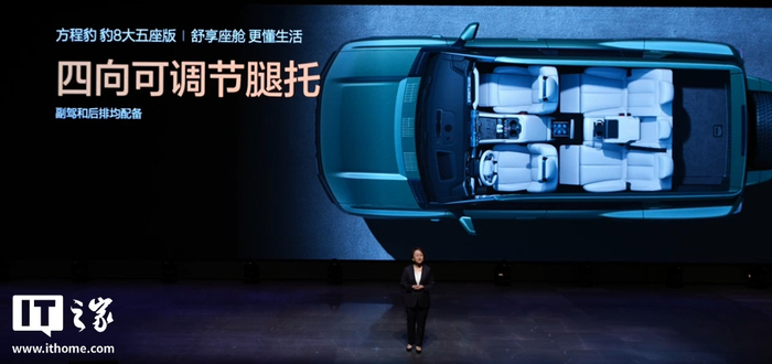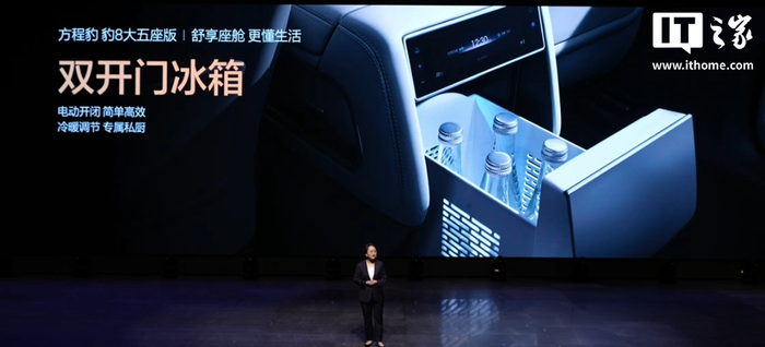 豹 8 大五座版的副驾和后排均配备四向可调节腿托,还搭载了双开门冰箱。
