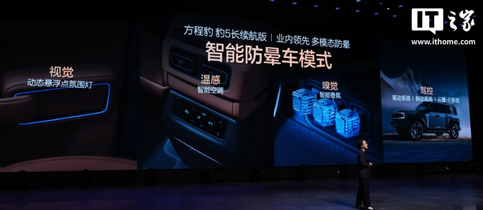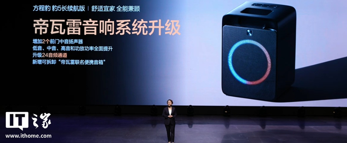 豹 5 长续航版首搭比亚迪智能空调 2.0 系统,支持实时感知环境,智能调节空调状态;帝瓦雷音响系统也迎来升级,增加 2 个前门中音扬声器,升级 24 音频通道,还新增可拆卸“帝瓦雷联名便携音箱”。