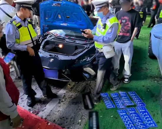 经初步核查,这两块号牌均为伪造,在进一步搜查中,民警在“兰博基尼”车内查获了大量尚未使用的伪造“豹子号”车牌。