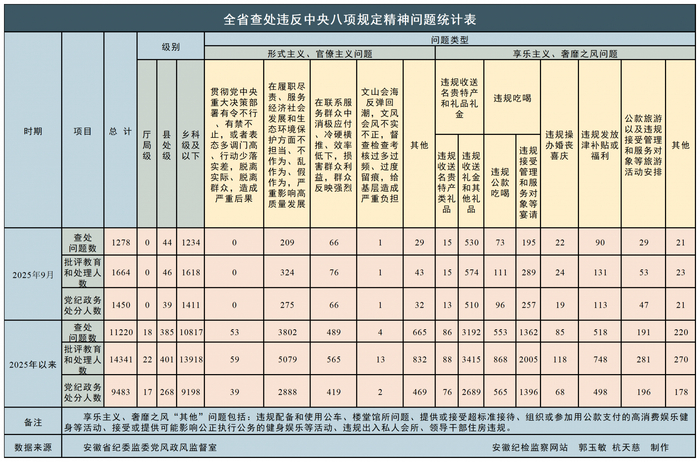 2025年9月,全省纪检监察机关共查处违反中央八项规定精神问题1278起,批评教育和处理1664人,其中党纪政务处分1450人。