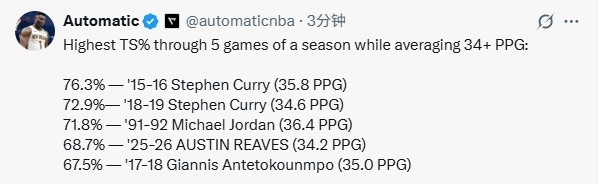 据数据媒体Automatic统计,在连续五场场均砍下34分以上的真实命中率排行中,里夫斯68.7%,仅次于库里和乔丹。