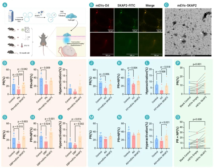 在这项研究中,研究团队利用牛奶来源的细胞外囊泡作为天然载体,将关键蛋白SKAP2装载于其中,再将其嵌入由羧甲基纤维素和海藻糖组成的水凝胶基质,这种水凝胶制剂可直接涂抹于阴囊皮肤,在多种精子损伤模型中分析了其对精子的修复效果。结果发现,在多种模型中,这种外用生物凝胶可显著提升精子质量。