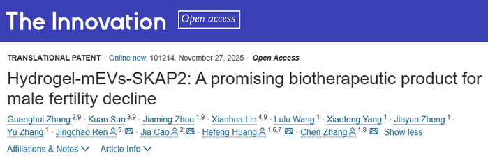 近日,中国科学院院士黄荷凤团队联合陆军军医大学曹佳教授团队等在国际期刊《The Innovation》的translational patent版块发表了一项研究成果:成功开发出一种名为“Hydrogel-mEVs-SKAP2”的外用凝胶,可通过局部涂抹于睾丸区域,显著改善精子活力,为男性不育治疗开辟了全新路径。
