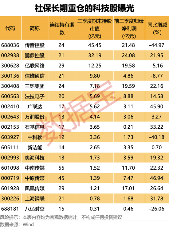 值得注意的是,社保基金还长期重仓了一些科技股。数据显示,社保基金连续重仓中南传媒、中原传媒、凤凰传媒、亿联网络、三环集团、传音控股6股24个季度及以上。其中传音控股、亿联网络等个股期末持仓市值均超10亿元。