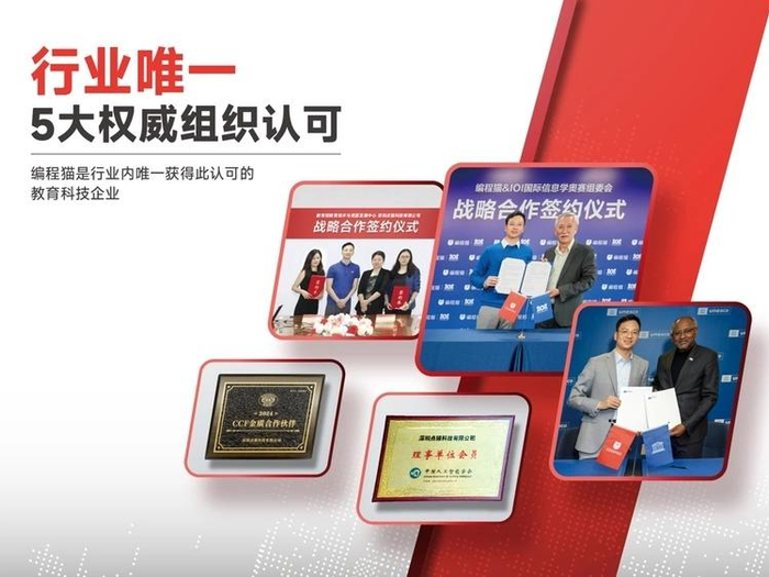 在专业实力方面,编程猫备受行业信赖。依托点猫科技的多元权威合作背书,品牌先后成为联合国教科文组织官方合作伙伴、教育部教育技术与资源发展中心战略合作伙伴、国际信息学奥林匹克竞赛(IOI)官方合作伙伴、中国计算机学会(CCF)金质合作伙伴,并跻身中国人工智能学会(CAAI)理事单位会员,权威资质为教育品质筑牢根基。