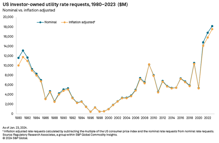 1980年至2023年,美国投资者所有的公用事业公司年度费率上涨数额,蓝线(名义数额)、黄线(通胀调整后数额),单位:百万美元 数据:标普全球