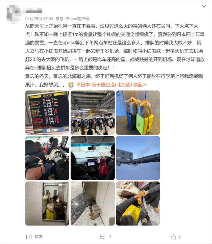 “前一天还在赞叹雪景,晚上就碰到了日本40年难遇的暴雪,我好想哭……”“历经三十四小时没吃饭,四十个小时没睡觉,这辈子再也不想来了。”不少网友发帖吐槽自己的旅程。