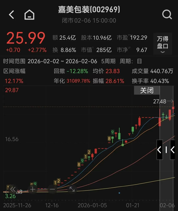 复牌后,嘉美包装股价维持涨势。Wind数据显示,2月2日至2月6日,嘉美包装股价累计上涨12.17%,最新市值为285亿元。