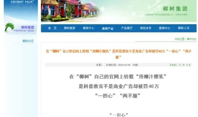 2024年,椰树因使用国家机关工作人员形象进行商业营销,并发布 “用椰子擦乳”“南太平洋美女很少‘飞机场’”等广告语,被罚款40万元。随后,椰树发布 “一担心”“两不服”声明,称转载内容是“科普教育”和“厂史教育”,不是商业广告。这套“不服”声明被网友指为“打苦情牌”“挑衅监管”。