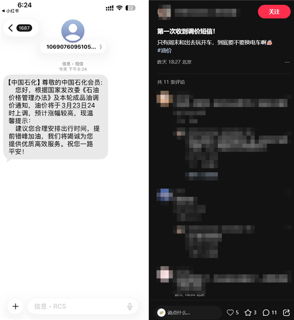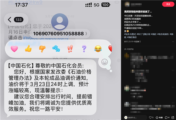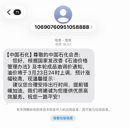 值得注意的是,中国石化日前已向全国会员发送提醒短信,提示油价将于3月23日24时上调,预计涨幅较高,建议车主合理安排出行时间,提前错峰加油。