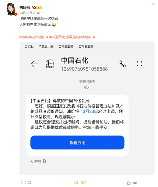 不少网友表示,这是第一次收到来自中石化的“错峰加油”提醒,汽车博主初晓敏也在微博发文称,“印象中好像是第一次收到”。